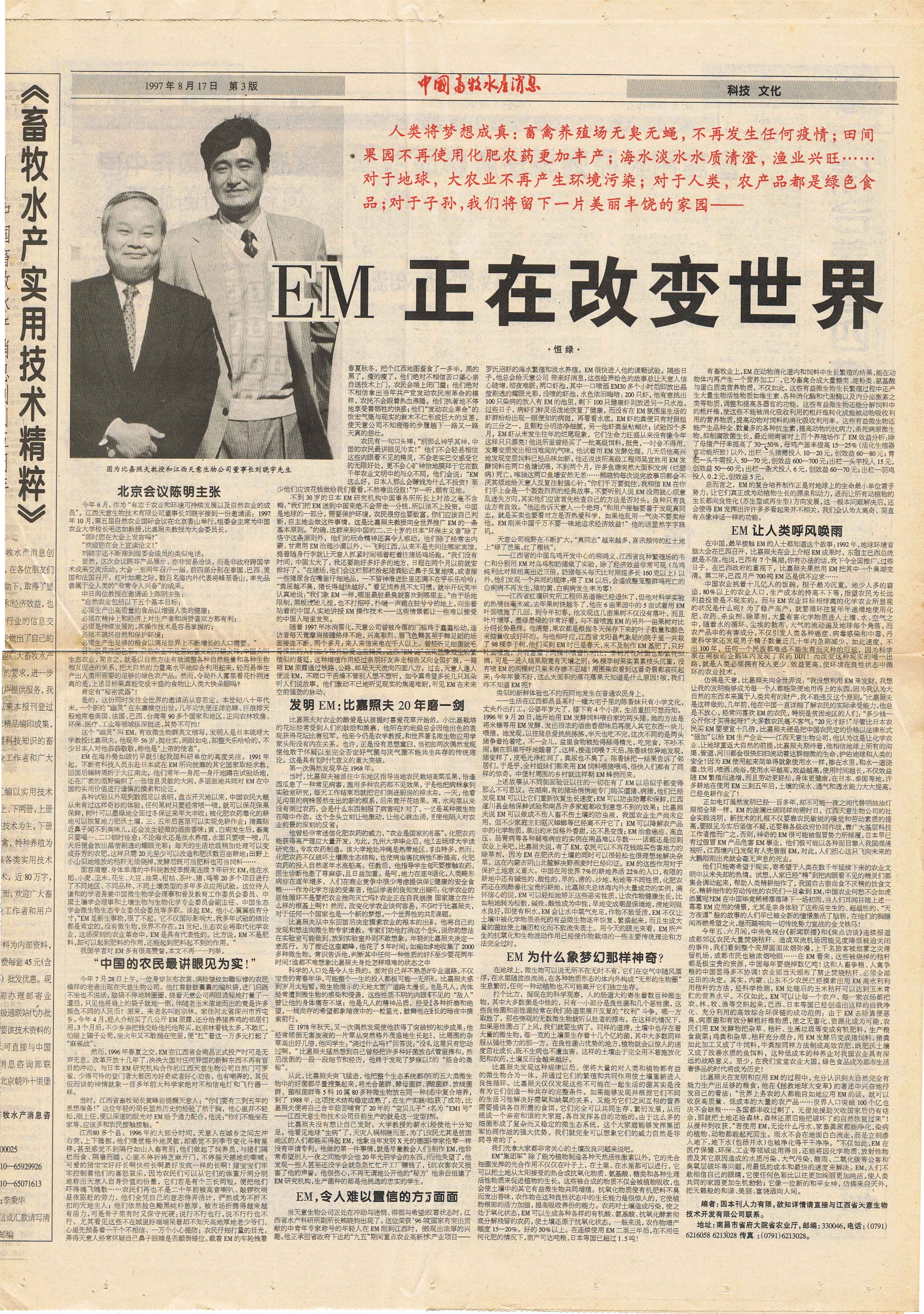 1997 1997年,継《中國畜牧水產報》、《科技日報》、《經濟參考報》、《江西日報》等媒體發表長篇通訊《EM原露正在改變世界》,各省科技、農業報刋均紛紛轉載,EM原露在江西最初的使用效果迅速在全國范圍內興起了一股熱潮,兩年內共簽定縣級代理合同500余家。